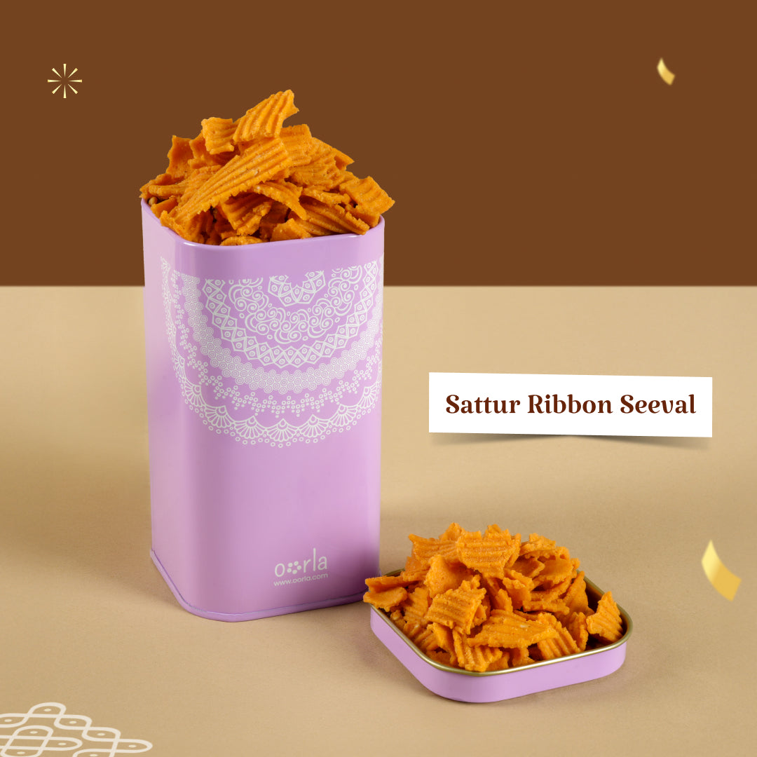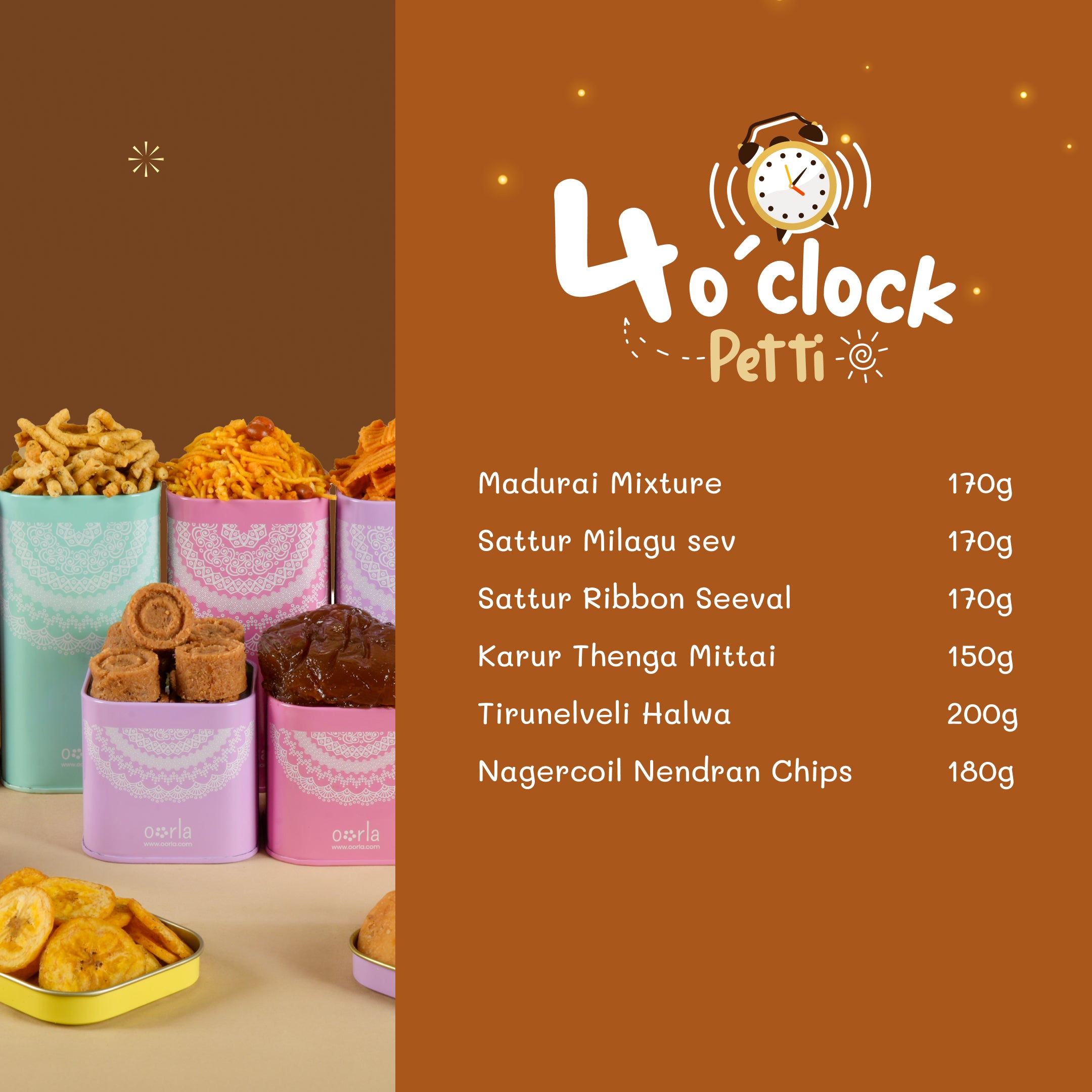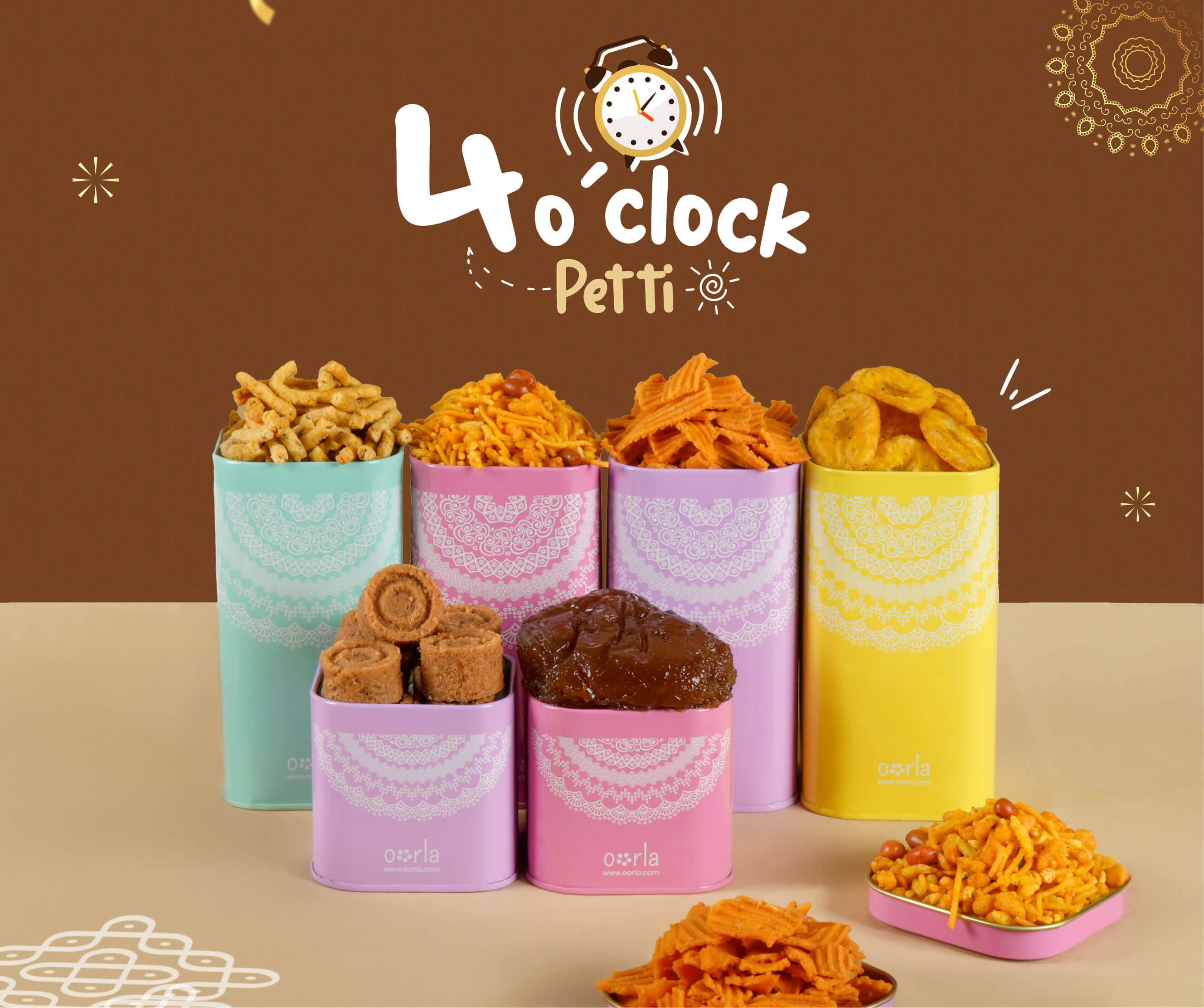 Oorla’s 4 o’ Clock Petti is your perfect tea-time partner! A nostalgic mix of South Indian favourites, Madurai Mixture, Sattur Sev, Thengai Mittai, Thattai, Halwa & Nendran Chips. All these snacks are freshly packed and ready to bring those cozy evening vibes home.