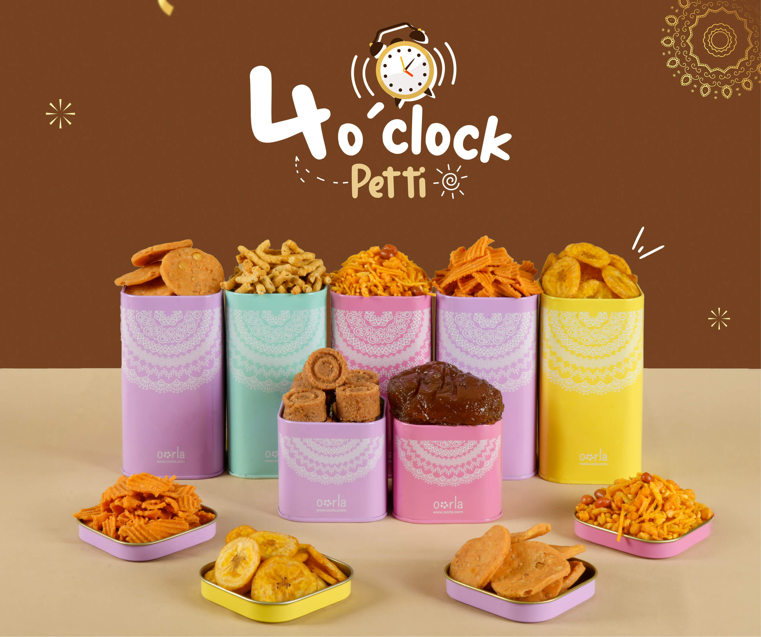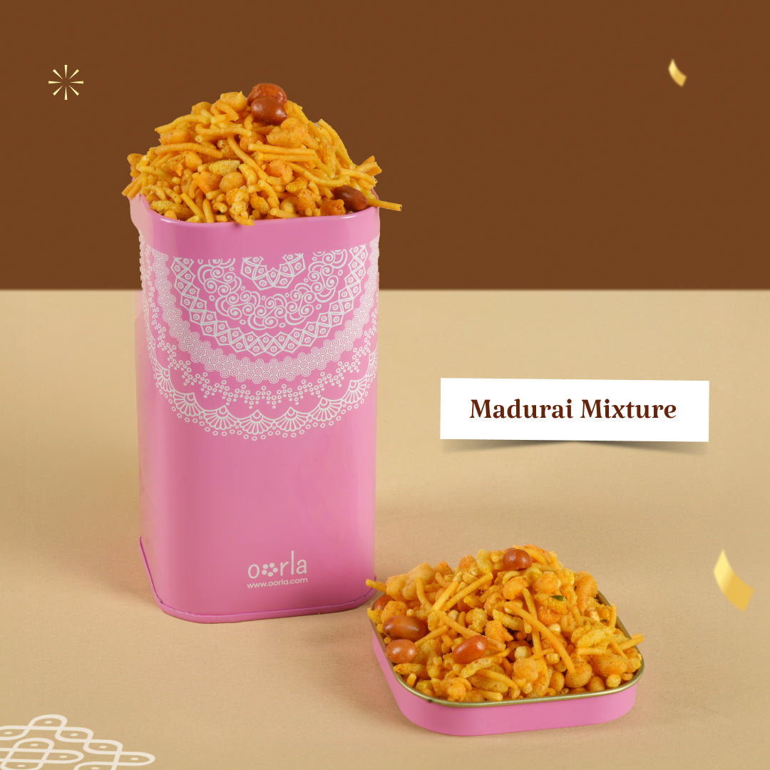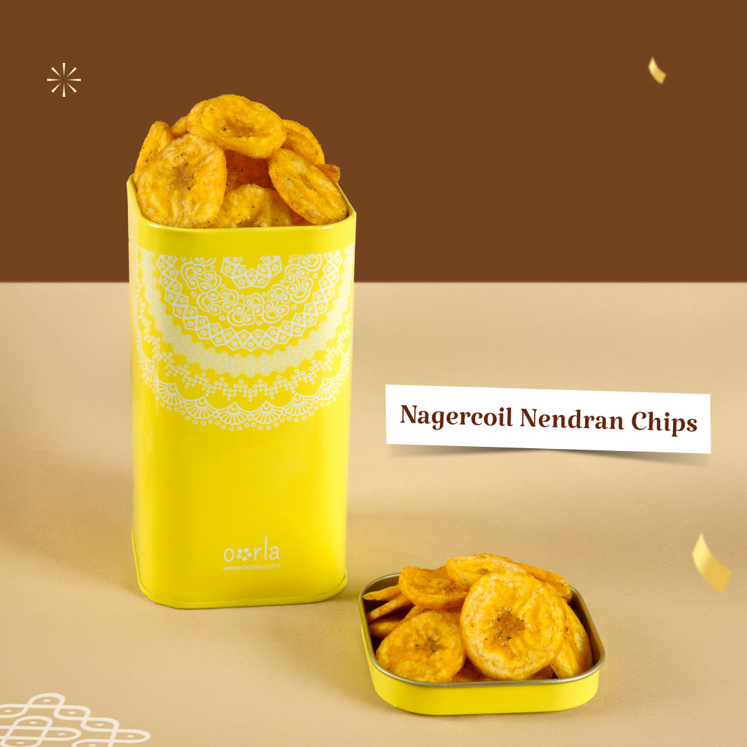 Oorla’s 4 o’ Clock Petti is your perfect tea-time partner! A nostalgic mix of South Indian favourites, Madurai Mixture, Sattur Sev, Thengai Mittai, Thattai, Halwa & Nendran Chips. All these snacks are freshly packed and ready to bring those cozy evening vibes home.