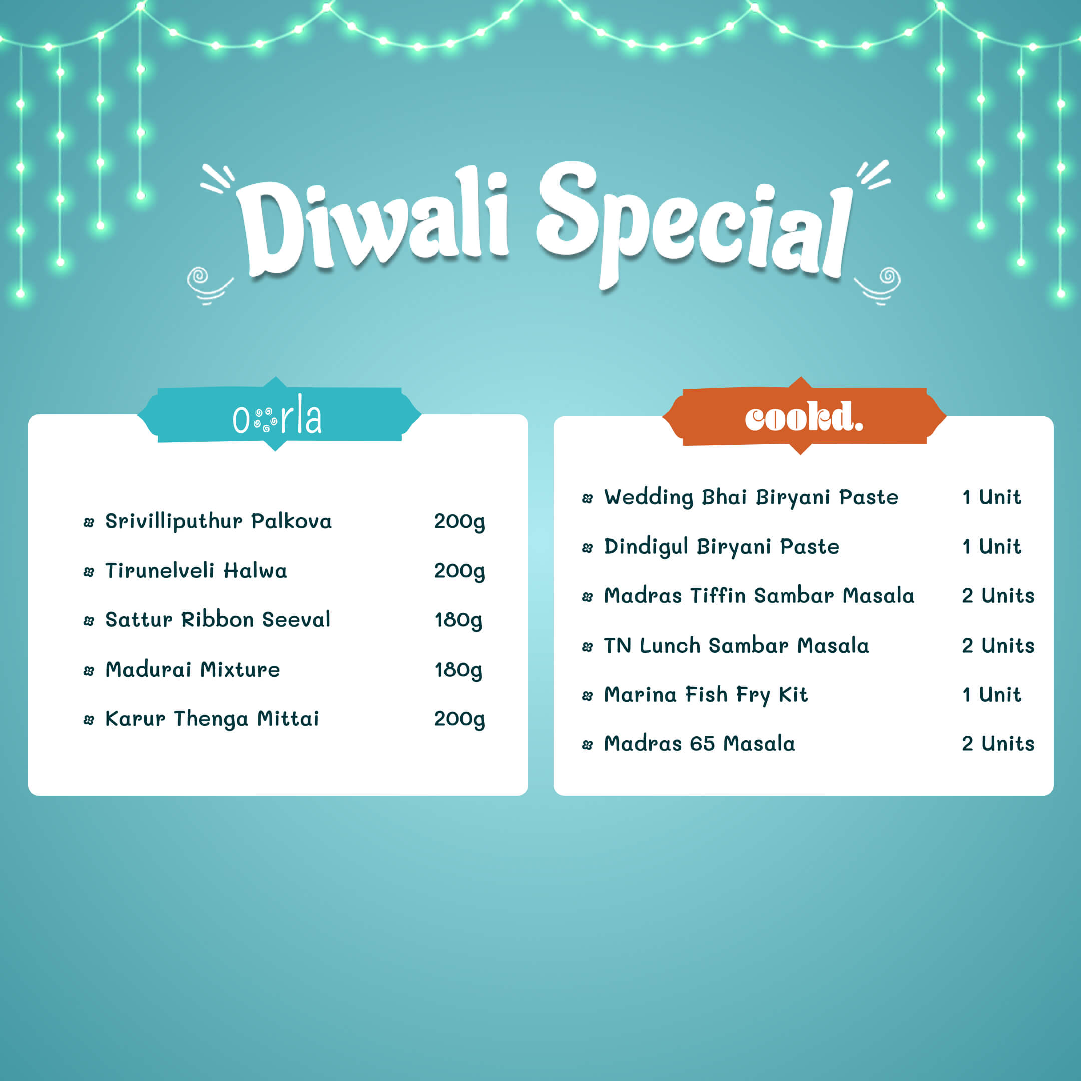 When Cookd’s kitchen staples meet Oorla’s traditional treats, you get the best of both worlds - Sapadu, Snacks & Sweets